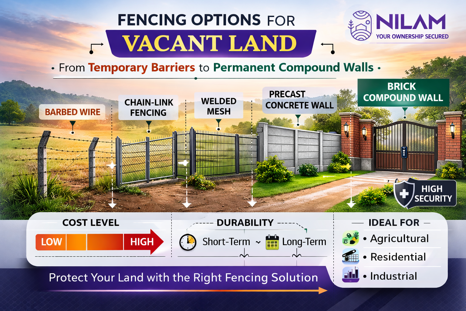 Fencing for vacant land can range from temporary barriers to permanent compound walls. Analysing the type of fencing required for a specific land parcel depends on several factors such as location, terrain, surrounding development, accessibility, and the level of security needed.